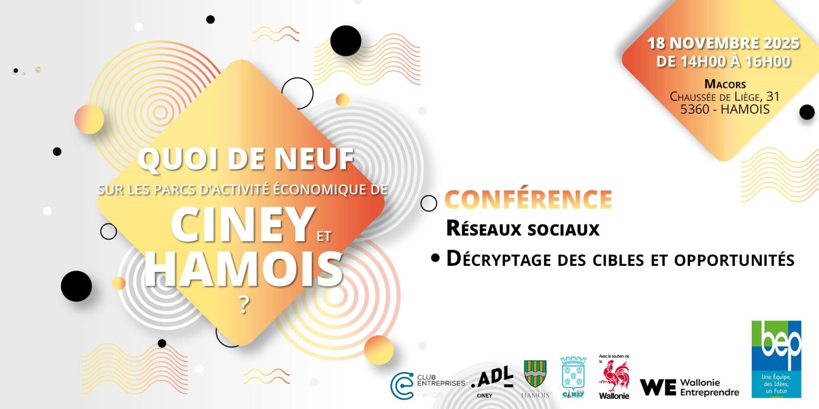 Le BEP, les Communes de Ciney et Hamois, le club d’entreprises et l’ADL de Ciney vous convient à une séance d’informations sur les actualités du monde économique, du parc d’activité économique et de la commune.